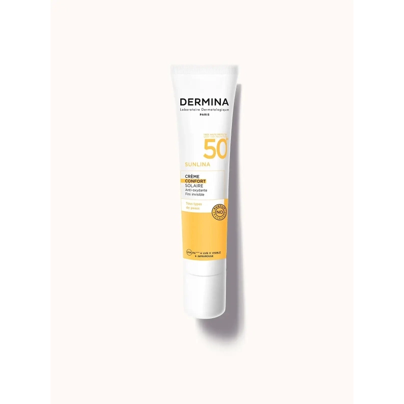 La Crème solaire Confort SPF50 DERMINA, véritable bouclier urbain du quotidien, enveloppe votre peau confortablement et lhydrate tout en lui offrant une très haute protection solaire.