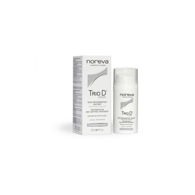 TRIO-D Emulsion dépigmentante, visage, corps et mains, diminue l'intensité des taches brunes, favorise leur élimination et prévient leur apparition. S'utilise en relais de Trio-A, les applications peuvent être poursuivies au long cours.